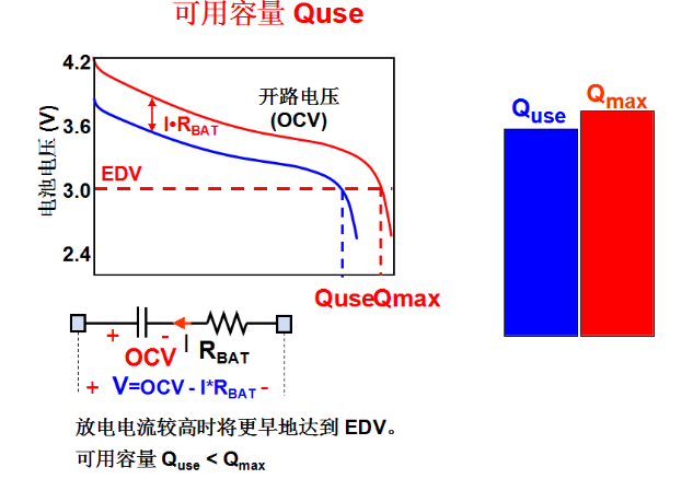锂电池的容量中还有一个对应的容量就是可用容量,可用容量实际上也许只用了80-90%!因为刚才讲的是电池的化学容量,锂电池的化学容量是在电流很小的时候测得的容量,它更多的是由电池本身的特性决定的。那实际在电池的使用过程中,这么多容量不是都能够放得出来的,在实际的使用过程中,由于有一定的放电电流,所以放电曲线会比开路电压曲线低,大家可以看到这条曲线,由于存在电池的内阻,实际的放电曲线是蓝色的这条曲线,由蓝色的曲线和红色的曲线对应的值得到Quse,Quse实际指的是电池的可用容量,在这张曲线中我们发现,由于电池内阻的存在使这个曲线的位置往下移了,那么放电的时候会更早的达到放电终止电压,也就是更早的达到EDV,所以Quse一般是小于Qmax。